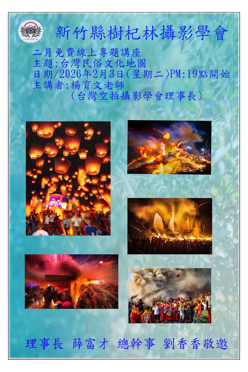 新竹縣樹杞林攝影學會二月免費線上專題講座主题:台湾民俗文化地圖日期/2026年2月3日(星期二)PM:19點開始主講者:楊育文老師(台灣空拍攝影學會理事長)