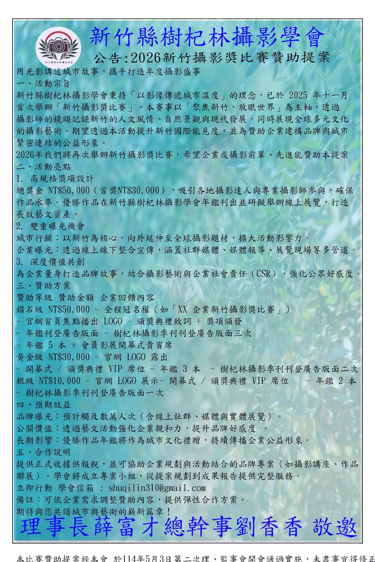 新竹縣樹杞林攝影學會 理事長 敬邀