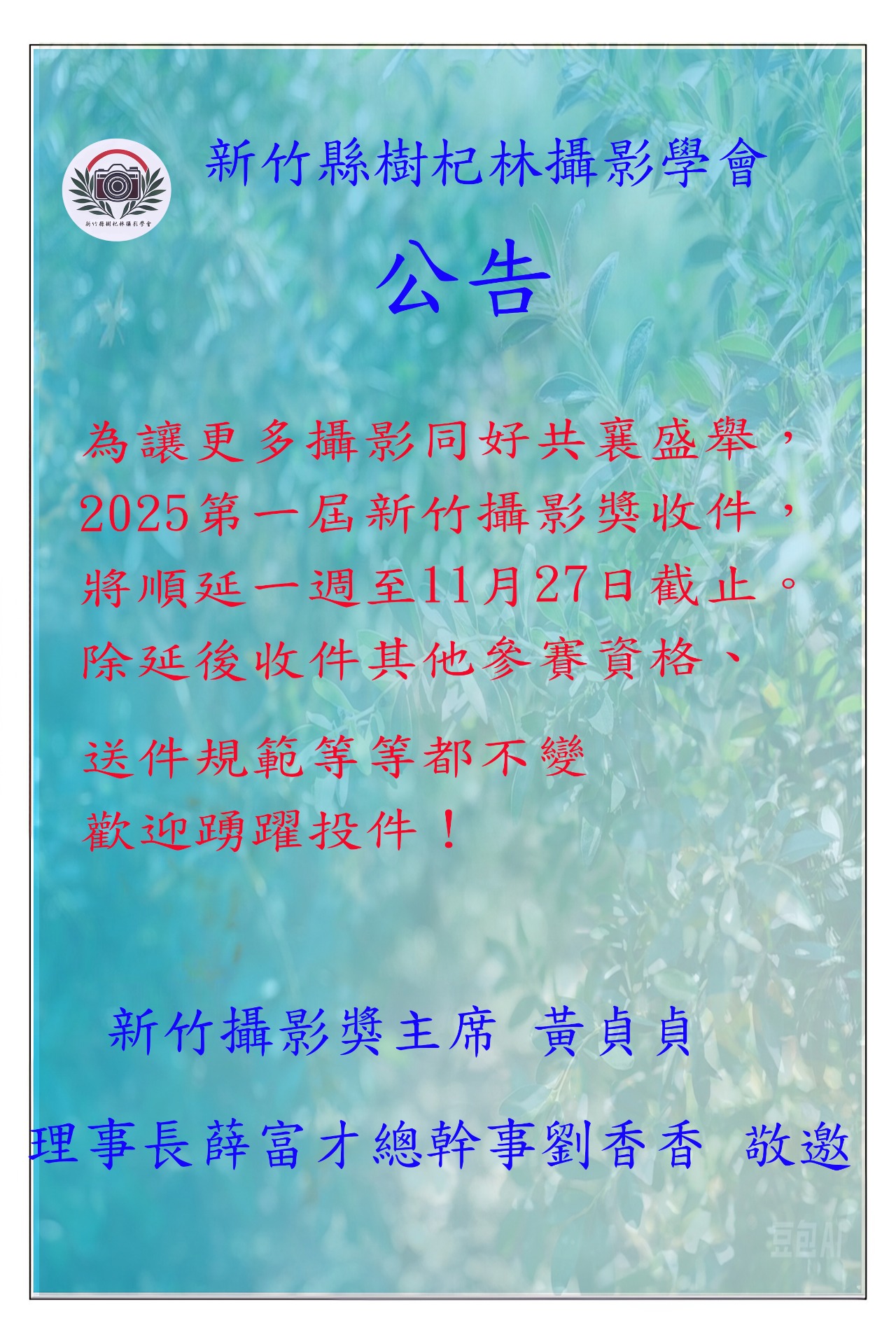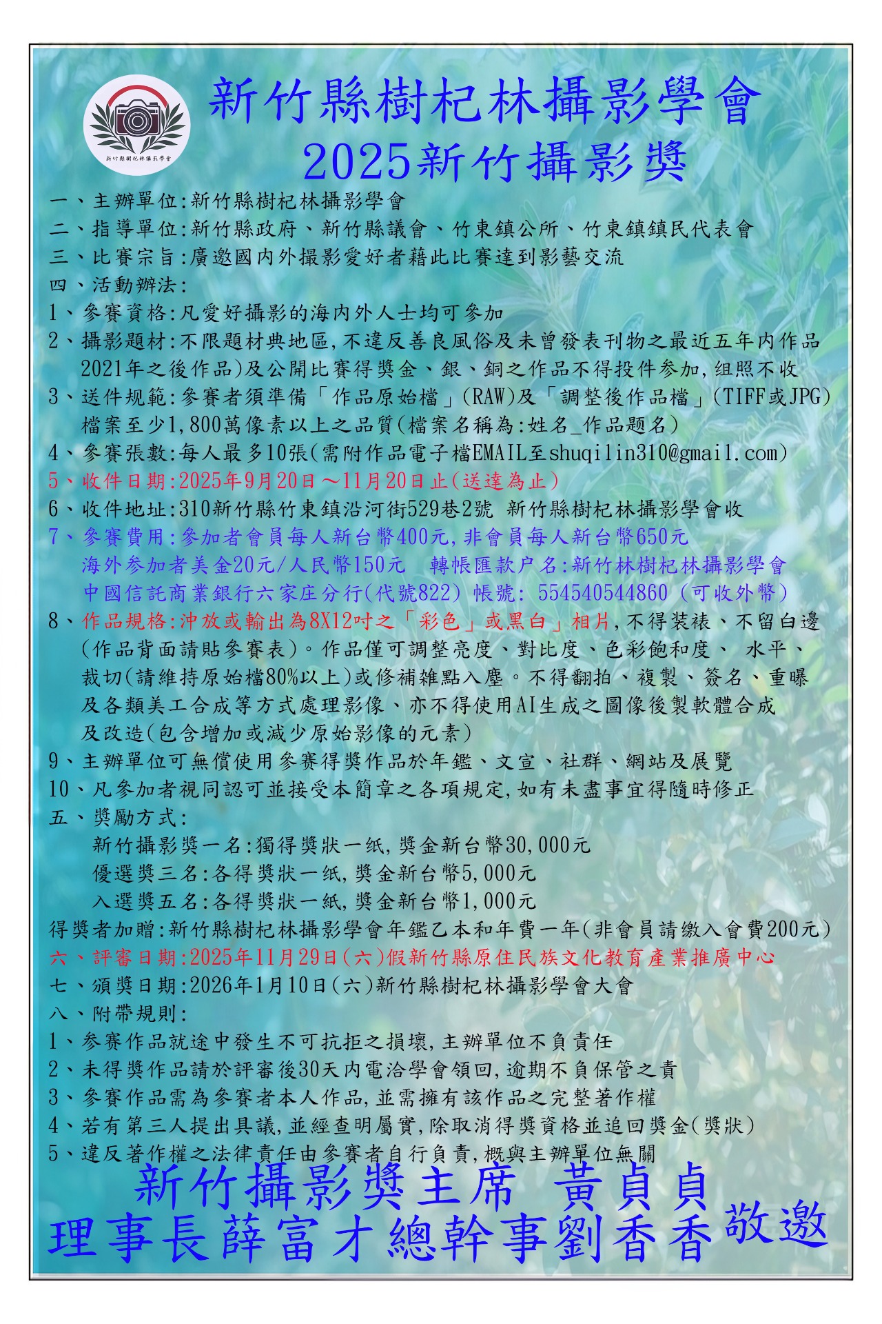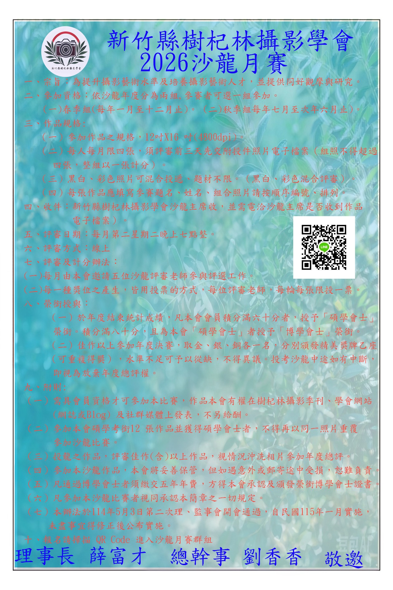 新竹縣樹杞林攝影學會2026沙龍月賽一、宗旨:為提升攝影藝術水準及培養攝影藝術人才,並提供同好觀摩與研究。