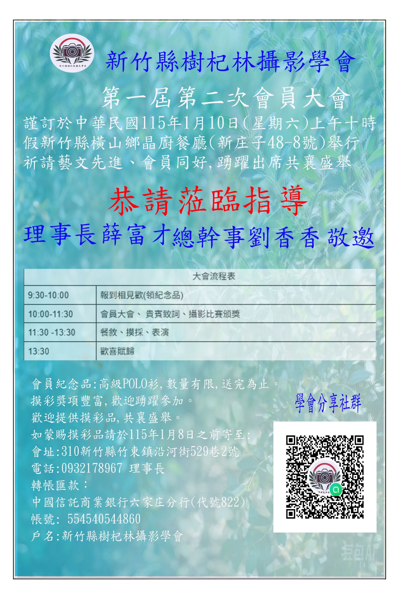 新竹縣樹杞林攝影學會第一屆第二次會員大會邀請函 恭請蒞臨指導